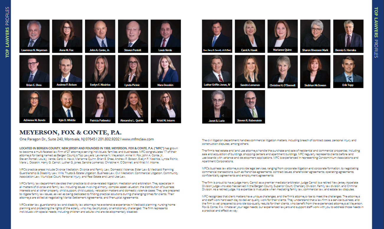 Meyerson, Fox & Conte, P.A. is proud to announce that 17 of its attorneys have been named as Bergen County's Top Lawyers: Lawrence N. Meyerson, Anne M. Fox, John A. Conte, Jr., Steven Pontell, Louis J. Verde, Carol A. Hawk, Marianne Quinn, Brian E. Shea, Andrew P. Bolson, Evelyn F. Nissirios, Lynda Picinic, Mara L. Dooskin, Harry G. Carroll, Luther G. Jones, Sandra Lomenzo, Christine H. O'Donnell, and Kristi M. Intorre.